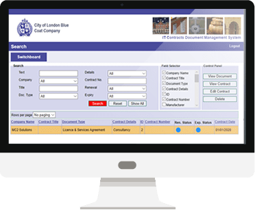 We have extensive knowledge in providing departmental contracts systems too ( e.g. Property, IT etc). Our system features a Traffic Light Event warning system for contracts coming up for renewal or expiry; the ability to upload multiple document types (contract, T&Cs, Quotation, non-successful-company-quotations and so on), plus full management reporting, and an extensive audit trail. Our bespoke product is designed to the client’s specific requirements, and can include any meta information required (enabling you to organise or search by such data).